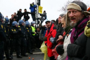 Ad aggiungersi ad una coerente interpretazione dei rapporti di causa/effetto ed al tentativo di concentrarsi sulle soluzioni alternative, troviamo altri nuovi spunti: un approccio più ragionato all’azione diretta, in grado di riconoscere l’urgenza di andare oltre le chiacchiere ma allo stesso tempo determinato a non scivolare nel logoro copione sbirri VS manifestanti. “La nostra azione sarà di disobbedienza civile” dichiarano gli organizzatori delle azioni del 16 Dicembre. “Oltrepasseremo ogni barriera fisica che troveremo sul nostro percorso – ma non risponderemo con violenza se la polizia tenterà un’esclation” (Detto questo, non c’è verso che un summit di due settimane non includa qualche scontro tra sbirri e ragazzi in nero; dopo tutto, siamo in Europa.)